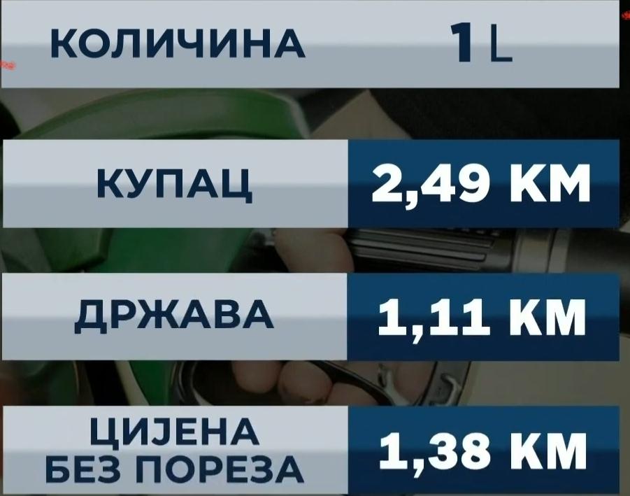 Za litar benzina od 2,49 KM, država uzme 1,11 maraka. Što znači da pola uzme država. Znači, kada vlast odrekla akciza, putarina, PDV-a, cijena goriva za građane bi bila 1,38 KM.
