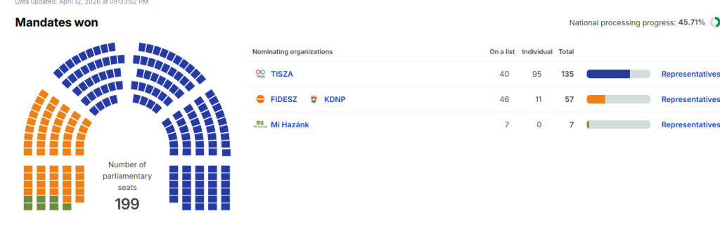 Trenutno je stranka Tisa na 128 mandata, a Fides je na 62 mandata. Ultradesničarska i neonacistička “Moja domovina” je prešla cenzus i trenutno je na osam mandata.