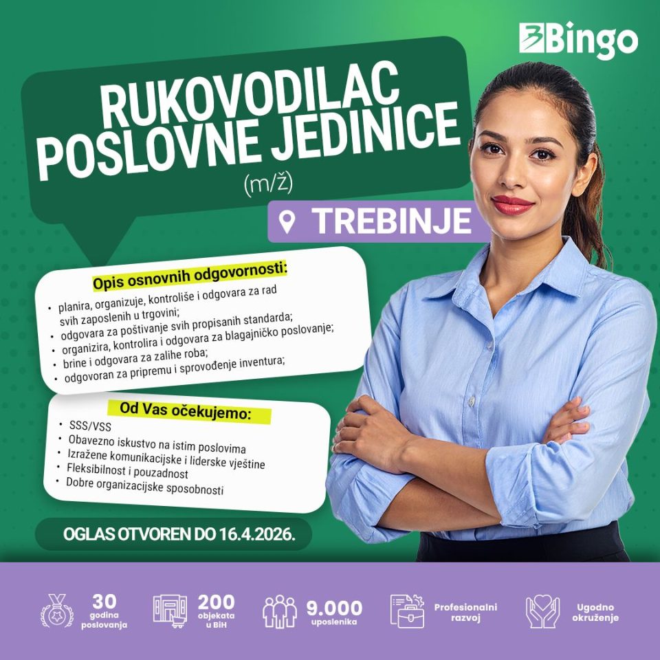 JU ZZZ RS – Trebinje: Oglašava slobodna radna mjesta na dan 01.04.2026. godine