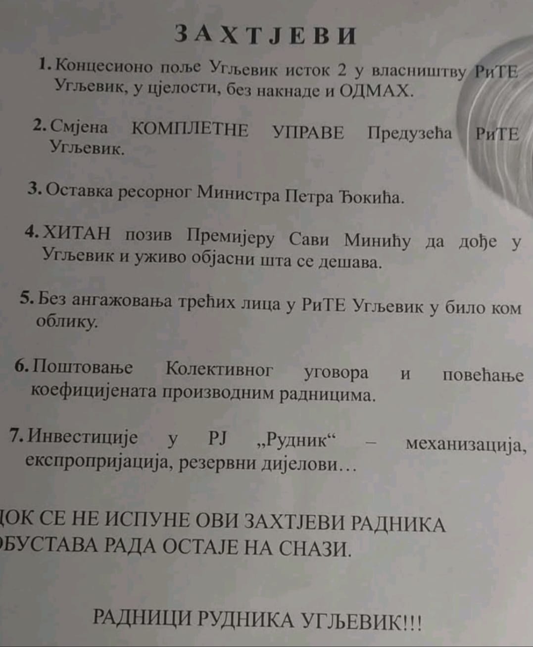 – Upućuju hitan poziv predsjedniku Vlade Republike Srpske Savi Miniću da dođe u Ugljevik i lično radnicima objasni šta se dešava